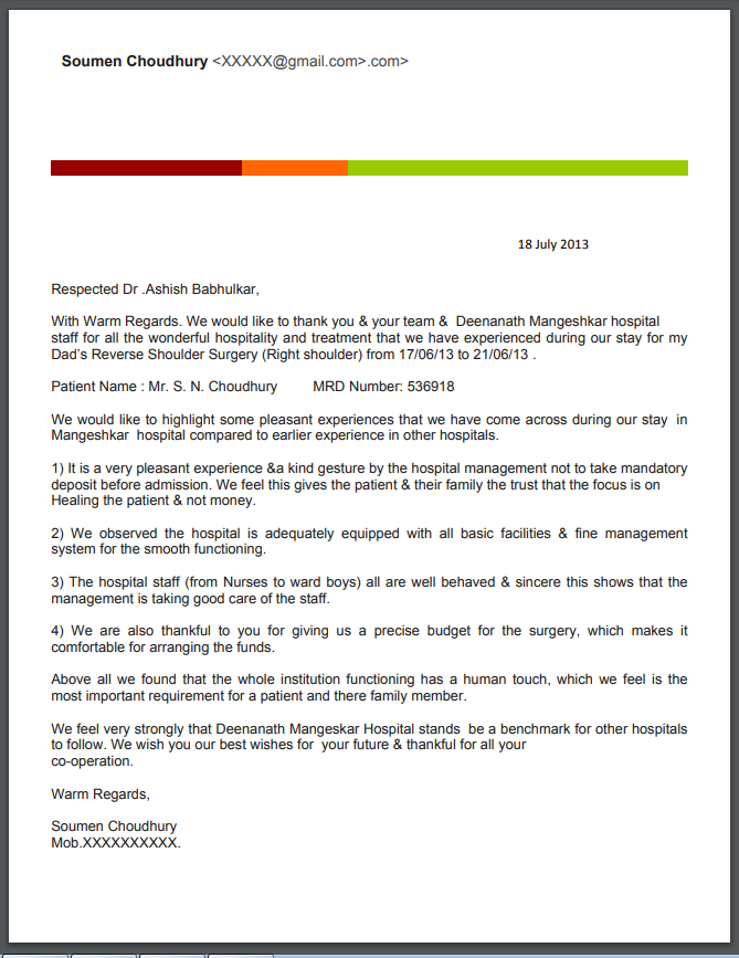 I would like u and your team to know how impressed me and my family r with the way u take care of your patients. From the first time I came to you in September till the time u finally performed the Orthoscopic surgery on my shoulder on the 23rd of January 2013, I have always felt that either one of your team was always available to answer all my queries. If I messaged or sent an email sooner or later i would get a response . Generally it is so difficult to get in touch with doctors. They r generally always too busy which is a fact, but u have trained your team that despite your busy schedule your patients get a hearing.
