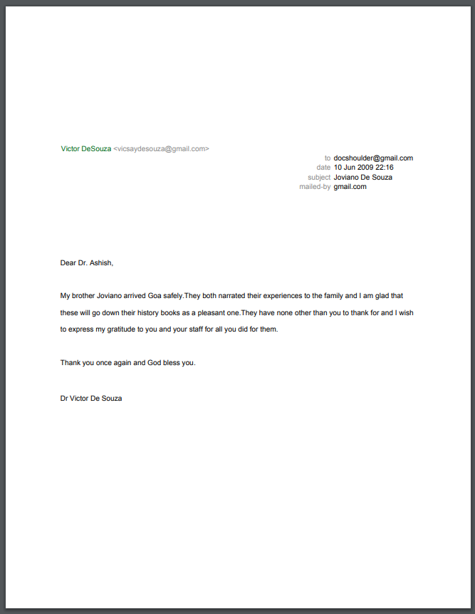 I used to stay in Mumbai and was your patient at Sancheti who went under your knife way back in early August 2005 for a Bankart repair for a very old recurrent shoulder dislocation condition. While I must have said my THANK YOUs when leaving the hospital or during a subsequent physiotherapy session, with passage of time I realize the immensity of the magic that you performed and the extent to which it has changed my life. My shoulder is now perfect so much so that I am not even conscious that I ever had an injury. I can swim, do pull-ups, play overarm sports - virtually do anything that I missed during almost 16 years while I carried the injury. With the results I got, I sometimes rue the fact that I neglected this problem for so long and had not found you much earlier.