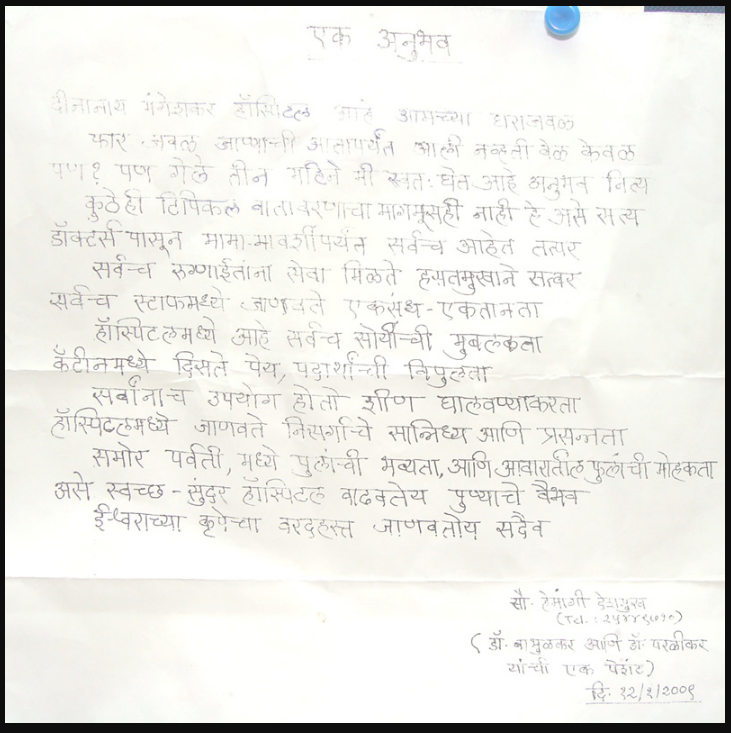 I was admitted to the Deenanath Hospital on the 30th.The entire team of doctors came to visit from time to time. In between routine tests were being done. I slept well that night.